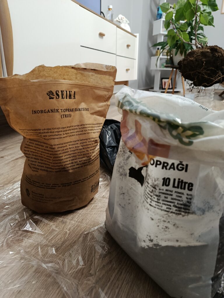 Çıkarmadan hemen önce de bahar bakımını yapmak istedim. Bu yüzden yeni bir toprakla ve daha geniş bir saksıyla dışarı almak istedim. Toprak karışımı için Zekai Yaman hocanın kitabındaki o meşhur formüllerden birini seçtim. Normalde bu malzemeleri toplu olarak alıyorsunuz. Ardından oranlayıp, formüldeki orana göre toprağı hazırlıyorsunuz.